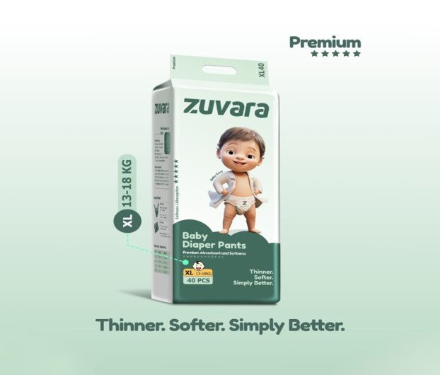 Zuvara Diapers are thoughtfully designed disposable baby diapers that provide long-lasting dryness, comfort, and skin protection for newborns and infants. Crafted with ultra-soft materials, these diapers are gentle on delicate baby skin and help minimize the risk of irritation and rashes. The advanced absorbent core quickly locks in wetness, keeping babies dry for extended hours, while the breathable design allows proper air circulation for added comfort. With a flexible 360-degree fit, Zuvara Diapers support natural movement, ensuring babies stay comfortable during sleep and play.